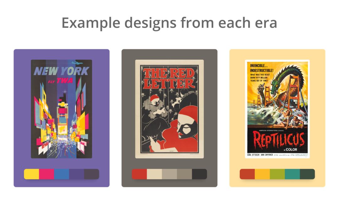 我从每个时代的 15 个配色方案中分别挑选了 4 个在文章里展示,如果你对更多配色方案感兴趣,或者想直接复制颜色应用,可以前往 Color Leap 网站 colorleap.app 。