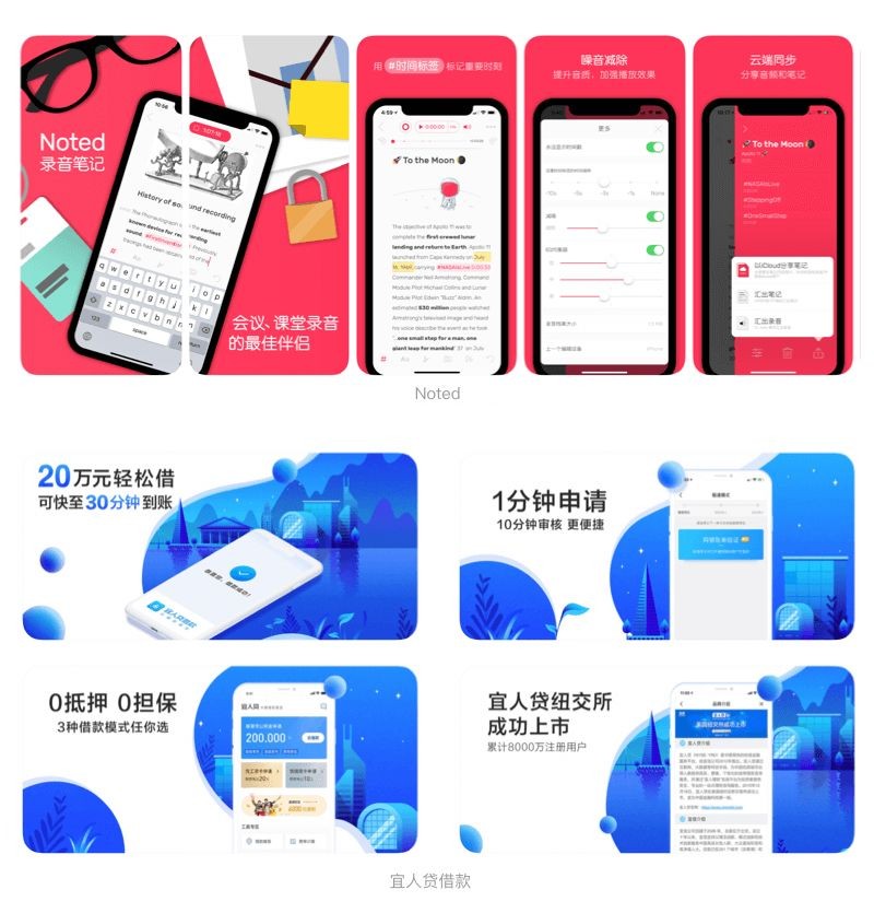 这种样式设计感较强有很大的发挥的空间,利用元素形成视觉中心,强调主题内容,形式活泼变化丰富,可以形成强烈的视觉效果吸引用户。但加入内容元素后,界面截图的展示相对会较小,同时设计成本较高。后面各平台有些较特殊尺寸的图,内容元素可能会需要单独调整,花费时间较多,前面提到的状态栏、手机框的问题都需要注意。