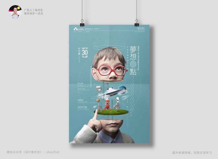 我们看这张海报其实也是有反常态的思想在里面,所以我们学习一些知识并不是为了固化思想,很多时候一张创意设计里面,我们可以融汇运用很多的设计手法,我们不仅要学以致用,还要融合自己的想法,开发自己的创造力,这才是学习进步的真正意义。