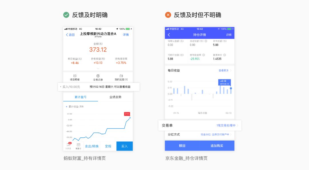 体验良好的产品总会在恰当的时间给予恰当的反馈,不反馈、反馈不及时、反馈信息不对都会让用户产生反感情绪(反思层),从而失去用户。涉及到资金流动的金融产品的反馈如果出现以上问题,用户的反感情绪尤甚。而好的反馈后帮助用户建立起对产品的良好印象,结合金融产品的特性,好的反馈会使用户对产品产生信赖感。
