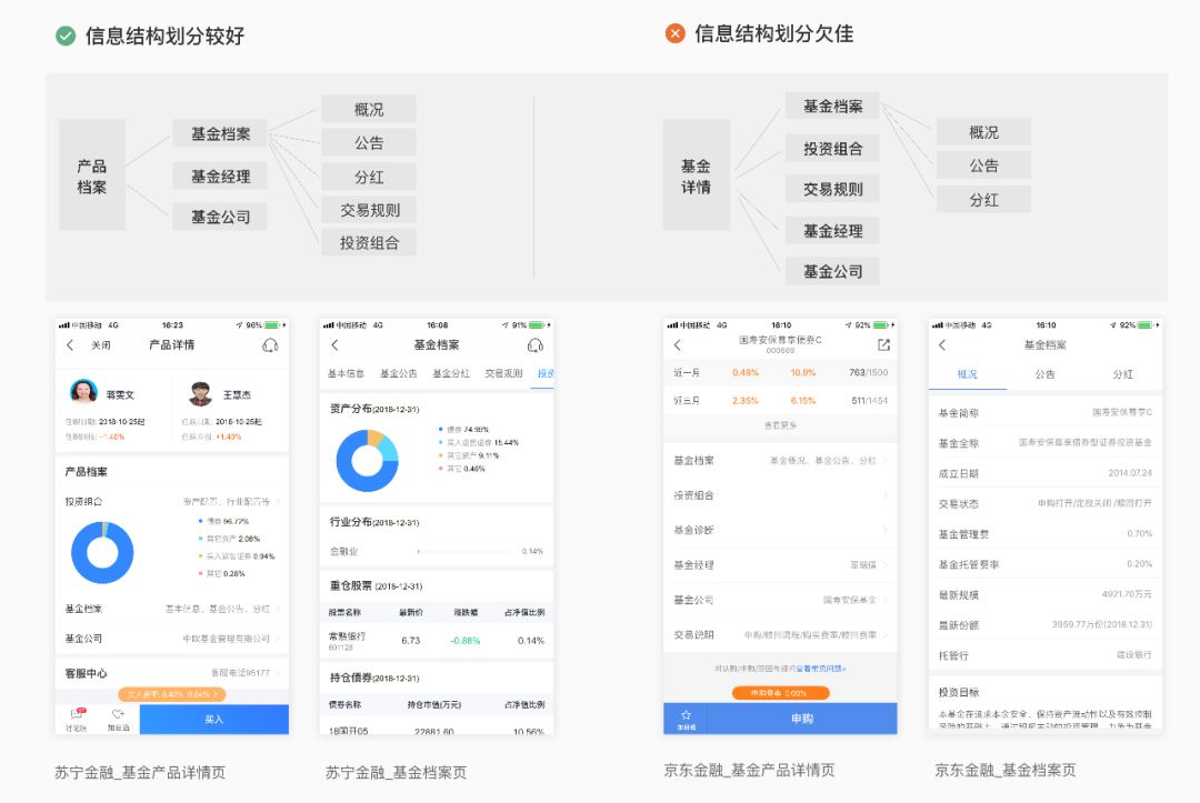 很多时候设计师是没有办法控制页面呈现的信息多少的,金融产品尤甚,在监管要求下,许多相关的金融条款信息必须展示给用户。在这种情况下,作为设计师,我们可以通过信息的组织来保障信息用户获取大量信息的效果。结构划分合理和信息层级清晰可以作为信息归类明确的两个依据。